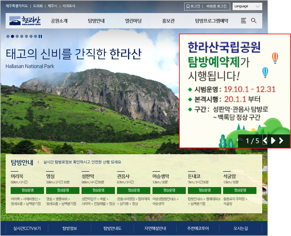 올해 10월부터 12월 말 까지 한라산 국립공원 탐방코스 중 탐방객들이 가장 선호하는 성판악, 관음사 코스를 예약제로 시범 운행합니다.